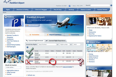 귀국을 몇 시간 앞두고... 청천벽력 같은 소식을 들었으니.... (이것도 누군가가 얘길 해줘서 알게 되었습니다) 인천공항의 기상악화로 인하여 프랑크푸르트를 출발하는 대한항공의 출발이 지연되었다고 합니다. 부랴부랴 프랑크푸르트 공항의 홈페이지에 접속해봤습니다... 첫번째 18:10 에 출발하는 루프트한자(독일항공)... 네~ 독일항공사이니 이상없다는 것 잘 알겠습니다. 한국에서 오는 비행기가 늦어서 그렇다면.. 자기네 다른 비행기를 준비하면 되니까요~ 오늘 같이 귀국하는 다른 네분이 더 계신데... 그분들은 출국 시 국내항공사의 비행편이 없어 루프트한자(독일항공)을 타고 오셨답니다. 정해진 시간에 출발 하시니 그저 부러울 따름이군요...ㅠㅠ 두번째 18:30 에 출발하는 아시아나... 아시아나 항공기는 ..
