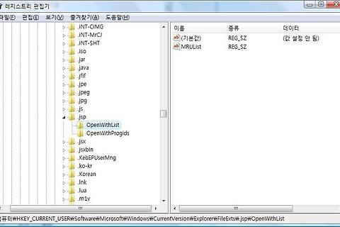 vista 를 사용하면서 몇가지 불편하고 다른 점을 느껴 짜증이 하나 둘 나는 중에.. jsp 파일을 SAP NetWeaver Developer Studio (SAP 의 Eclipse tool)에서 더블 클릭 했다.. 미리 보기 창이 열리며 이런 형식의 파일을 열때 항상 확인.. 이라는 의미의 체크박스와 함께 어떤 파일로 열 것인가가 나왔었다.. source 버튼을 눌렀으면 될 것을, 아무 생각없이 Ultra-Edit 에 연결을 해버렸었다;; 그 이후는 연결 프로그램의 해제를 해도 계속 울트라 에딧으로 열리는데.. 뚜껑 열릴 뻔;;;; 그리하여, 레지스트리 중 \HKEY_CURRENT_USER\software\Microsoft\Windows\CurrentVersion \Explore\FileExts\.j..